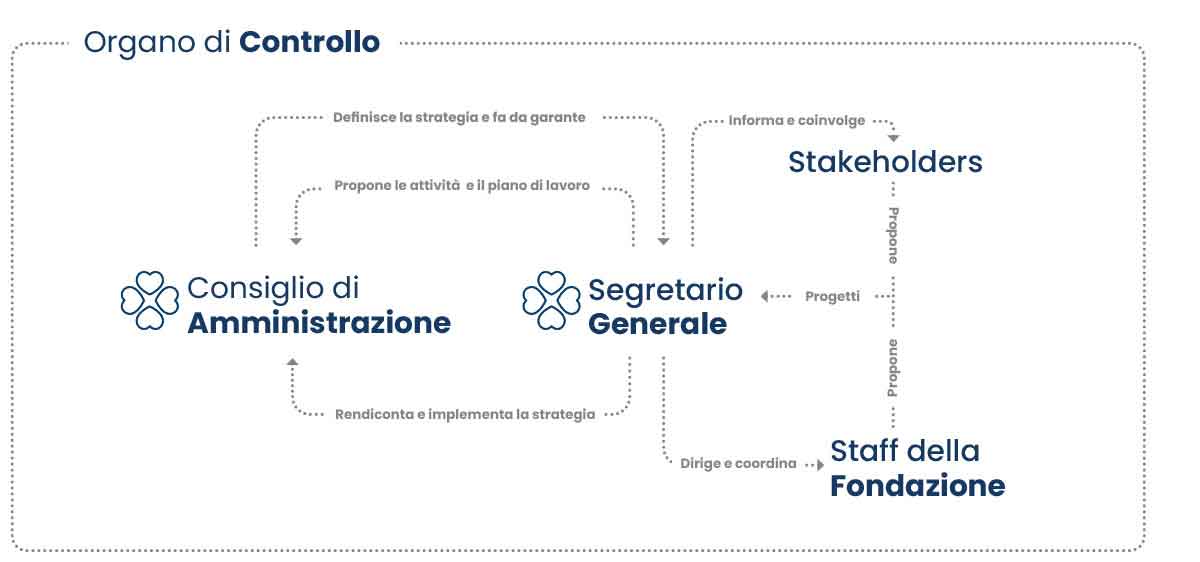 Il Consiglio di Amministrazione elabora la missione, gli obiettivi e le strategie in base all’atto costitutivo, ai principi che ispirano la Fondazione e alle raccomandazioni ricevute dallo Staff.